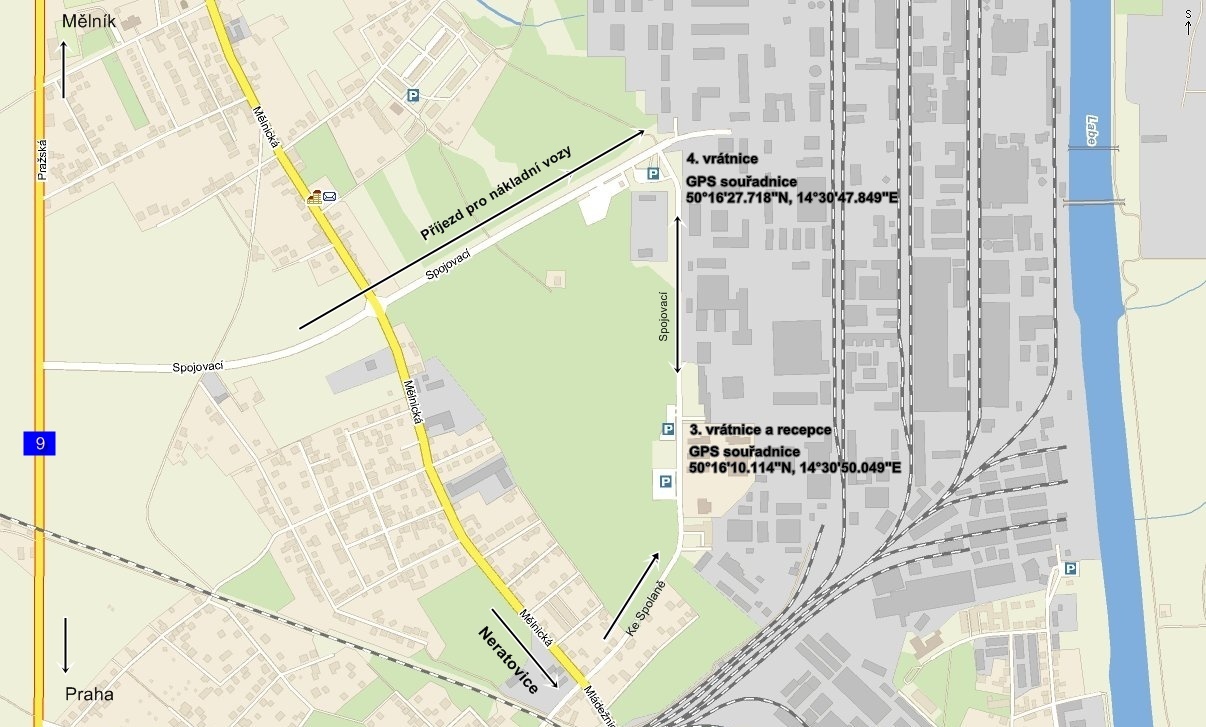 K vjezdu do areálu slouží vrátnice č.3 umístěná vedle recepce (viz mapa, GPS souřadnice: 50°16'10.114"N, 14°30'50.049"E). Příjezd od Prahy nebo Mělníka (ze silnice č. 9, Praha - Mělník) je ulicí Spojovací (obec Libiš). Od Neratovic je příjezd možný ulicí Ke Spolaně.